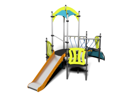 Farverigt klatretårn med rutsjebane og klatrebro – Den ideelle løsning til skolegårde og offentlige legepladser – Kontakt os i dag for et tilbud eller mere information!